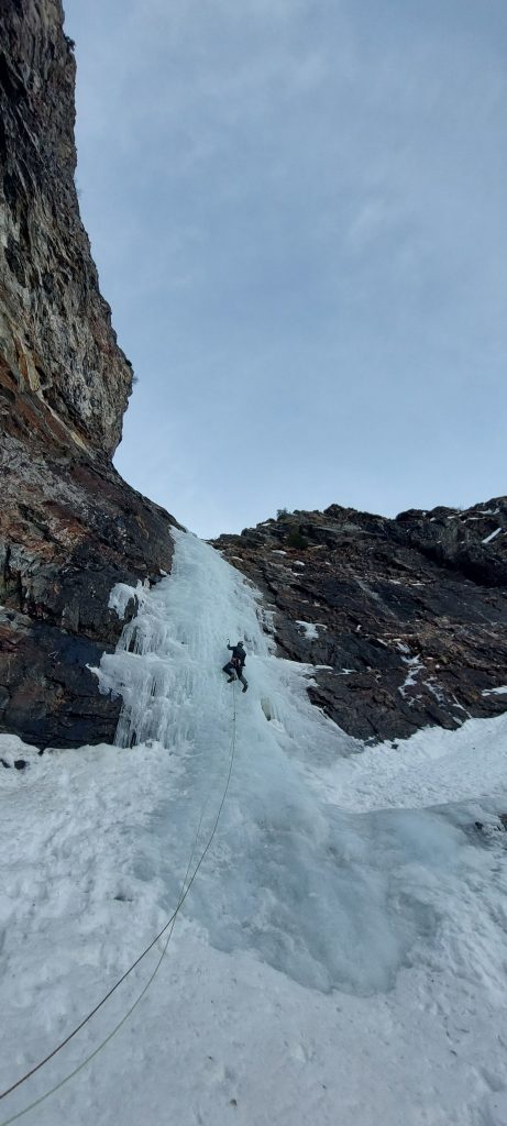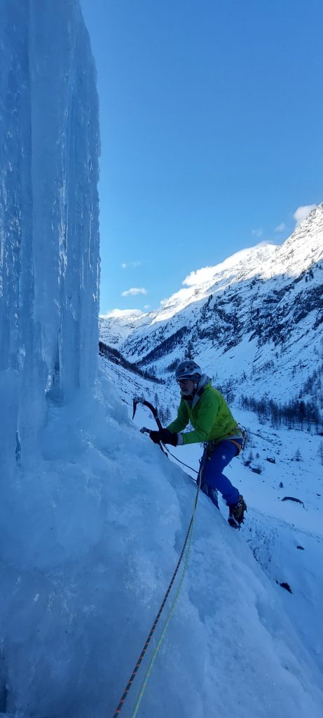 Im längsten Eisfall von Cogne mit einem glücklichen Gast und einem unglücklichen Steinbock.