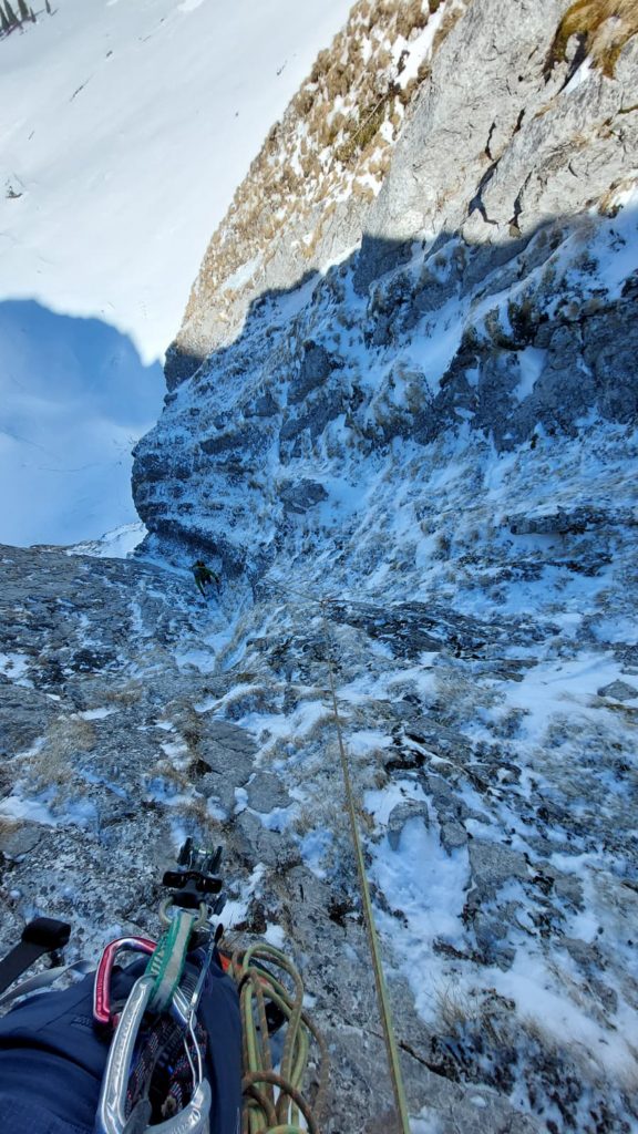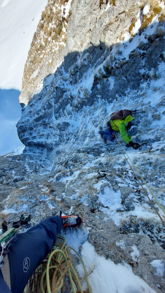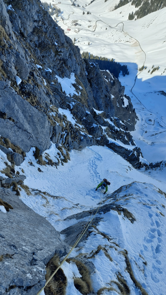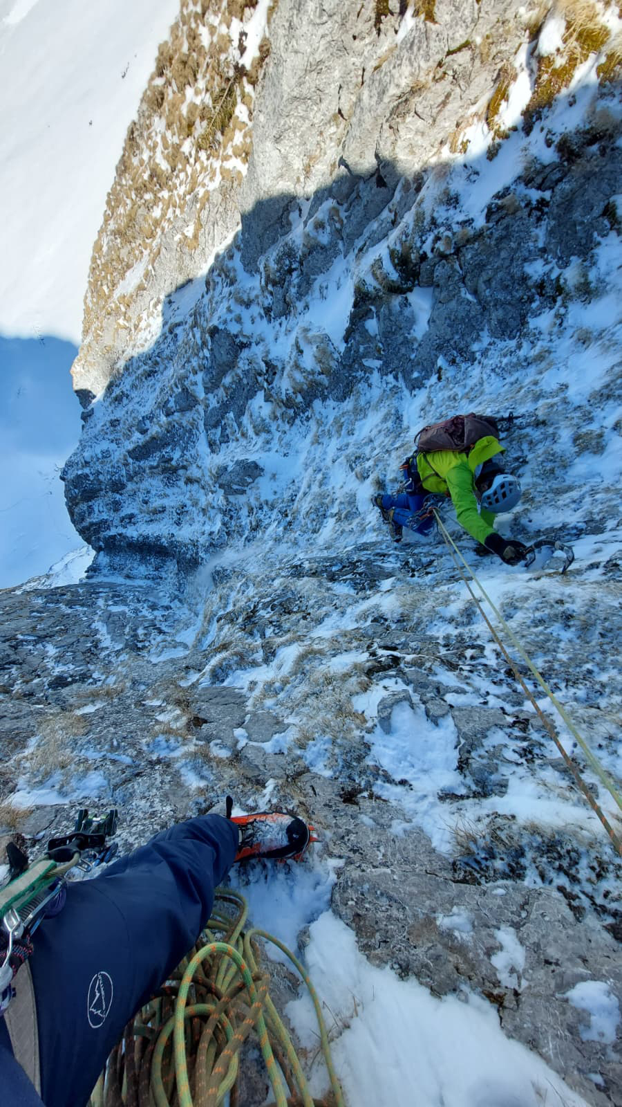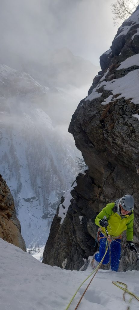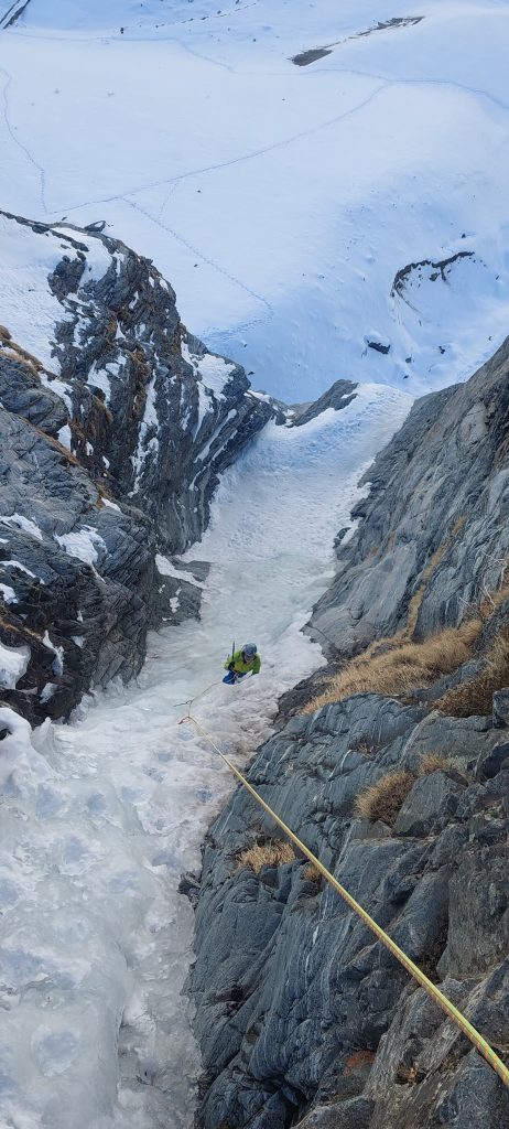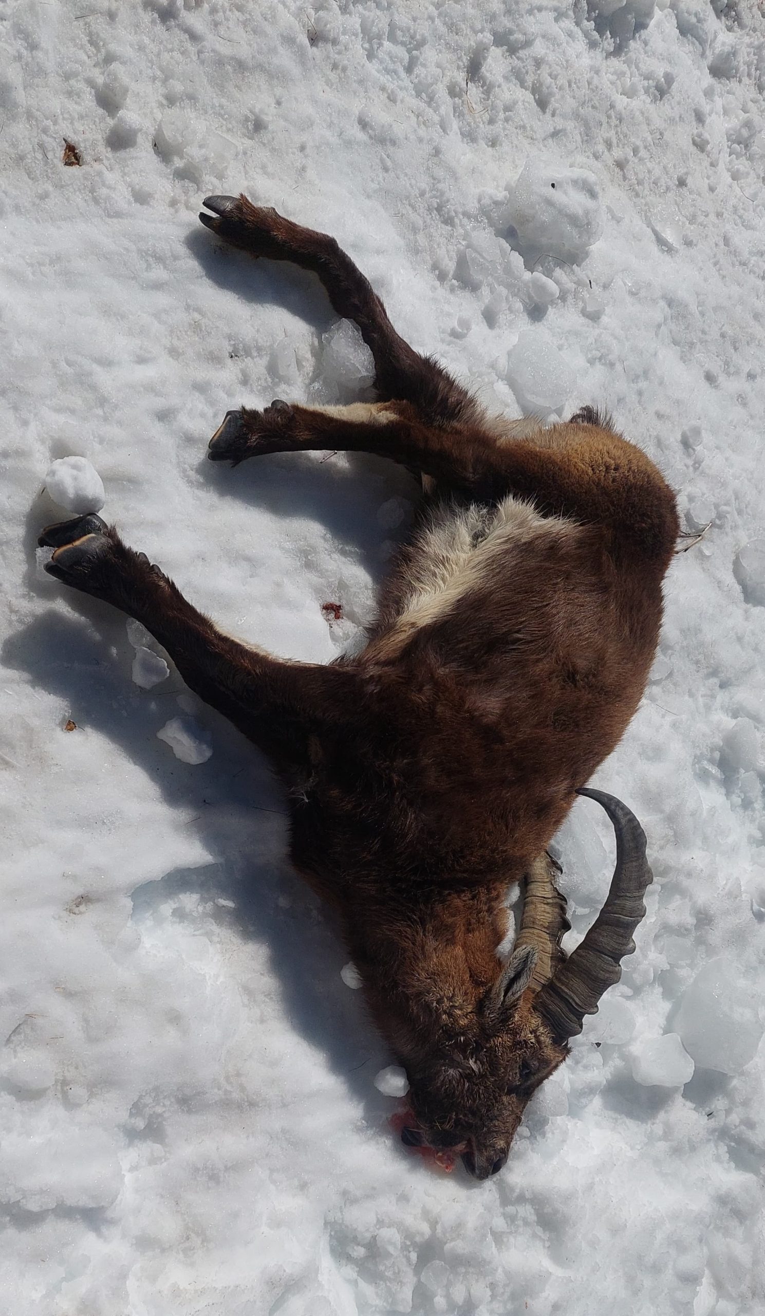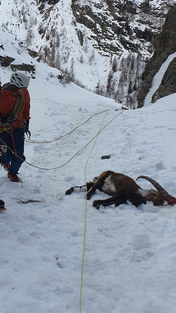 Alles lief wunderbar an diesem Tag in «Cold Couloir», dem längsten Eisfall des Cognetals. Bis ich aus dem Augenwinkel ein grosses, dunkles «Etwas» auf uns zu rasen sah. Der Steinbock musste – womöglich in einem Kampf – ausgerutscht sein und schlug einen Meter über unseren Köpfen ein. Wir fanden ihn 300 Meter weiter unten vor.